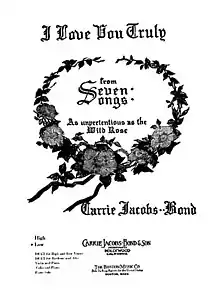 Carrie Jacobs-Bond began to write songs in 1894 to supplement the income of her husband, Frank Bond.[1] When he died in 1895, she returned briefly to her hometown of Janesville, Wisconsin, where "I Love You Truly" was written.[2] She then moved to Chicago where she painted china and rented out rooms to make ends meet.[1] There she continued to write songs and eventually sought to publish them herself. With the encouragement and assistance of friends, including a loan from contralto Jessie Bartlett Davis, in 1901 she published a sheet music collection of her compositions called Seven Songs as Unpretentious as the Wild Rose, one of which was "I Love You Truly".[1] She published it again as a separate song in 1906, at the same time correcting an oversight and filing for copyright. It sold over a million copies,[3] one of the earliest songs composed by a woman to achieve that distinction.[lower-alpha 1] Jacobs-Bond was invited to sing at the White House by Presidents Theodore Roosevelt, Warren G. Harding, and Calvin Coolidge, and sang "I Love You Truly" each time.[3]