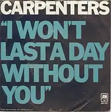 "I Won't Last a Day Without You" is a song by The Carpenters with lyrics written by Paul Williams and music composed by Roger Nichols. It was released in the U.K. in September 1972, paired with "Goodbye to Love" as a double-A side. The single reached No. 9 and spent 14 weeks on the chart. It was later released in the U.S. and became a hit single for them in 1974, reaching No. 11 on the Billboard Hot 100 chart and number one on the easy listening chart.[1] It was the Carpenters' ninth No. 1 on the easy listening chart.