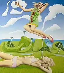 In 1967 Scott's stylised landscapes began to feature women clad in bikinis or fashionable garments of the era such as mini skirts – images that were often appropriated from popular culture, including magazines (such as Vogue and Playboy) and newspapers. They feature landscapes that capture the distinctive emblems of West Auckland, such as native forest and Kauri trees and West Coast beaches. The style of painting, with meticulously and smoothly rendered transitions and details, knowingly takes up the "hard-edged" tradition in New Zealand painting associated with Rita Angus, McCahon and Don Binney.[10] Scott's paintings of the 1967–70 period have been labelled the "Girlie" series on account of their frolicking, scantily clad female protagonists.[11] Important examples of works that fit this description include Land of Dreams (1968–69, private collection), Rainbow Girl (1969, Waikato Museum of Art and History Te Whare Taonga o Waikato), Homage to Morris Louis (1969, Real Art Roadshow), Jumpover Girl (1969, Victoria University of Wellington), Leapaway Girl (1969, Museum of New Zealand Te Papa Tongarewa) and Sky Dash (1969–70, Auckland Art Gallery Toi o Tāmaki), Agronomist (1970) and Teller (1970).