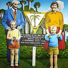 Track (1968, Auckland Art Gallery Toi o Tāmaki) is based on a photograph of the publisher – and protector of endangered Kauri forests – A.H. Reed with his daughter and grandchildren; Scott has them posing stolidly in front of an Auckland Regional Council sign and a stand of Kauri trees. The radical and iconic nature of this painting prompted the poet and art-writer David Eggleton to exclaim that it "charges out of the late 1960s like a rogue elephant," a phrase that nicely captures Scott's propensity for brazenly disrupting the norms and conventions of New Zealand art.[13]