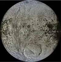 - ↑ The bright trailing hemisphere, with part of the dark area appearing on the right (the equatorial ridge is in profile on the right limb). The large crater Engelier is near the bottom; to its lower right can be seen the rim of a partly obliterated, slightly smaller older crater, Gerin.