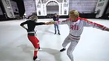 Oxana Domnina (left), Ivan Skobrev (right) and the producer Ilya Averbukh (front) in a rehearsal for the show