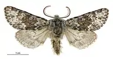 Face grey. Palpi blackish at base. Head and thorax grey, frontal area lighter grey. Head and thorax densely clothed with long dark-grey hair. Thorax broad in proportion to length, with a slight posterior crest. Abdomen grey. Forewings grey, with pale grey lines and occasional darker marks. A single light-grey line at base; a jagged grey line about 15, strongly dentate near dorsum; outwardly suffused with dark grey. Orbicular faintly shown in light grey, and separated from reniform by a distinct dark-grey patch. Reniform faintly outlined in light grey. A jagged light-grey line at 34, bending towards termen until centre of wing, then inwards before reaching dorsum. Terminal edge margined with light grey, edged basally with a dark suffusion, which forms a faintly defined line; slight grey marks along veins where they reach termen. Cilia short, light grey and dark grey alternate patches. Hindwings light grey with a faint ochreous tinge, a darker band across wing at J and a slightly waved subterminal band. Terminal edge and cilia grey-white. Underside grey with a faint ochreous tinge and a well-defined irregular dark-grey line at about 34 across both wings.[2]