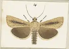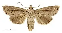 Ichneutica epiastra is a moth of the family Noctuidae.[1] It is endemic to New Zealand and is found throughout the North, South and Stewart Islands. This species prefers open habitats such as wetlands, dunes and forest clearings. Eggs are laid in the summer or autumn and larvae feed during winter and spring. The larval host species are found within the genus Austroderia. The adult moths are on the wing between October and February. Adult I. epiastra can possibly be confused with the similar species I. arotis and I. haedifrontella however there are differences in appearance that enables I. epiastra to be distinguished from these two species. In particular I. epiastra has long sharp-tipped ‘horns' on its head that are diagnostic. The adults of this species appear reluctant to be attracted to light although they do come more frequently to the brighter mercury vapour traps.