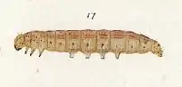 The full grown larva is 1+7⁄8 inch in length, dull brownish green in colour, sometimes tinged with reddish brown, especially on posterior segments. The dorsal and subdorsal lines are very narrow but fairly well marked; dull white in colour faintly edged with red or reddish brown. The lateral line is somewhat indistinct, white in colour. On it are situated the spiracles which are dull cream-colour edged in black. The lateral line is often edged with small brown blotches situated above the spiracles, and on the anterior segments these blotches are sometimes joined to form a broad, faintly marked upward edging to the lateral line. The integument, especially on the dorsal surface, has a number of fine white branching veins, and on each segment is a number of minute black dots from which spring short brown bristles. The prolegs are of the same colour as the body, edged with dark-brown hooks. The head is horny, amber in colour, mottled and netted with brown. [5]