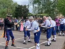 In the Victorian era, villagers would gather May blossoms and leave garlands in doorways.[4] These garlands often consisted of a cloth stretched over a wooden hoop, with two dolls, representing the Virgin Mary and the Christ Child, fastened in the centre of the cloth. The hoop had ribbons sewn around its frame, and flowers fastened to the cloth; children would stop at houses and charge money to see the garland.[9] A procession through the village is held, led by characters known as the "Moggies"; these comprise the Sweep and his wife (both may have blackened faces), the Lord and the Lady, all four of whom are played by men. Originally, these characters would visit houses carrying garlands, may boughs,[8] and besoms (a type of broom made from a bundle of twigs) asking for ale; they would sing a Day Song, returning the next day to ask for payment.[10] The name "Moggies" is identified by Brian Shuel with the nearby village of Moggerhanger.[8]