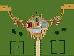 Ickworth House, the ground floor. 1: Library; 2: Drawing Room; 3: Dining Room; 4:Entrance and (inner) Staircase Hall; 5:Smoking Room; 6:Pompeian room; 7: Orangery and West Wing; 8: East (Family) Wing; 9: Portico; 10: Topiary Garden.