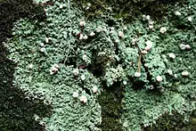 Icmadophila is a genus of crustose lichen. The genus has a widespread distribution in the Northern Hemisphere and contains six species.[2] The only species found in North America, Icmadophila ericetorum, has a mint green crustose thallus that is dotted with bright pink apothecial disks, and is sometimes colloquially referred to as "fairy puke".[3] It aggressively grows over mosses on well-rotted wood and peat.[4] It looks very distinctive, but may be confused with species of Dibaeis.
