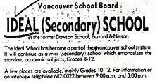 Ideal School was established in 1972 by teacher Garry Nixon, a teacher at St. George's School. It was intended to be an independent, alternative high school. The Province reported that "[t]o be admitted, boys and girls must convince Nixon they sincerely want to learn and are willing to work harder than would be required in other schools", and that it would cost $60 a month in fees.[4] Nixon published a job posting in The Vancouver Sun, promising prospective teachers "freedom, fascination and abject poverty".[5] Six teachers comprised the original staff, chosen from a pool of over 60 applicants, and with much lower salaries than what could be expected at a public school.[4] Ideal School was originally housed in the Vancouver Fancy Sausage Factory, on 16th Avenue and Heather Street. The blood gutters had to be cleaned out before the staff and students could move in.[6] Faced with financial difficulties, in 1974 the school approached the Vancouver School Board for economic support.[7]