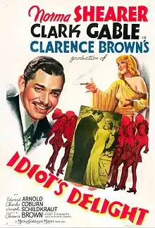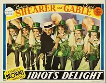 Idiot's Delight is a 1939 MGM comedy drama with a screenplay adapted by Robert E. Sherwood from his 1936 Pulitzer-Prize-winning play of the same name. The production reunited director Clarence Brown, Clark Gable and Norma Shearer eight years after they worked together on A Free Soul. The play takes place in a hotel in the Italian Alps during 24 hours at the beginning of a world war. The film begins with the backstory of the two leads and transfers the later action to a fictitious Alpine country rather than Italy, which was the setting for the play. In fact, Europe was on the brink of World War II. (The studio's attempts to make the film palatable for the totalitarian states—including the hazy geographical location and the scrupulous use of Esperanto in speech and signage—were a waste of time. They banned it anyway.[3]) Although not a musical, it is notable as the only film in which Gable sings and dances, performing Irving Berlin's "Puttin' On the Ritz" with a sextette of chorus girls.