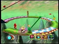 Iggy's Reckin' Balls is a simple racing game with tower-based levels.[2] The players must pull themselves up to the next level of a tower using a grappling hook, which can also be used to grab and slow down opponents.[2][3] Each type of stage is divided into 10 towers. The players race up the tower and the first to reach the top is teleported back to the bottom. Once two or three laps (or just one in final towers in each world) have been completed, the tower is destroyed and the player moves on to the next tower. There are ten worlds in Iggy's Reckin' Balls, each containing ten towers.
