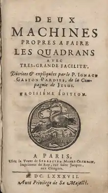 Pardies was born in Pau, France, the son of an advisor at the local assembly. He entered the Society of Jesus on 17 November 1652 and for a time taught classical literature; during this period he composed a number of short Latin works, in prose and verse. After his ordination, he taught philosophy and mathematics at the Collège de Clermont in Paris, which would eventually become the Lycée Louis-le-Grand. His earliest scientific work is the Horologium Thaumanticum Duplex (Paris, 1662), in which is described an instrument he had invented for constructing various kinds of sundials. Three years later appeared his Dissertatio de Motu et Natura Cometarum, published separately in Latin and in French (Bordeaux, 1665). His La Statique (Paris, 1673) argued that Galileo's theory was not exact. This, along with Discours du mouvement local (Paris, 1670), and the manuscript Traité complet d'Optique, in which he followed the undulatory theory of light (which identifies it as a harmonic vibration), form part of a general work on physics which he had planned. Traité complet d'Optique had been studied by Pierre Ango (1640–1694) a confrere of Pardies for his Book L`Optique[2] which he published in 1682 after Pardies early death. The Manuscript has also been mentioned by Christiaan Huygens in his Treatise on Light. Huygens himself mentioned in 1668 that it has been Pardies' Theory that the speed of light is finite.[3]