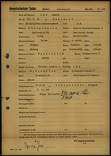 Registration form of Ignacy Jeż as a prisoner at Dachau Nazi Concentration Camp