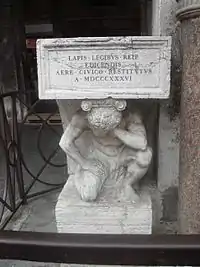 Il Gobbo di Rialto (the Hunchback of the Rialto) is a marble statue of a hunchback found opposite the Church of San Giacomo di Rialto at the end of the Rialto in Venice. Sculpted by Pietro da Salò in the 16th century, the statue takes the form of a crouching, naked hunchback supporting a small flight of steps.