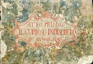 The libretto is based on Chapters XXXIII and XXXIV of Don Quixote in which a curate staying in the same inn as Don Quixote reads aloud one of the innkeeper's favourite stories, "Ill-Advised Curiosity". It is unclear who Anfossi's librettist was. In his 1970 book Das alte Burgtheater als Opernbühne, Otto Michtner lists Giovanni Bertati as the librettist. However, the 2000 edition of The New Grove Dictionary of Music and Musicians notes that could have been either Bertati or Giuseppe Petrosellini.[1] The premiere of Il curioso indiscreto took place during the Carnival season of 1777 at Rome's Teatro delle Dame, where Anfossi's La vera costanza had premiered the previous year. Since women were not allowed to perform on stage in the Papal States at that time, the opera premiered with an all-male cast. The stage design was by Gabriele Montarenzi with costumes by Carlo Brogi and Vincenzo D'Amora. The performance included two untitled ballets choreographed by Giacomo Romolo.[2]
