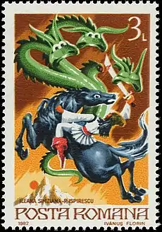 A Romanian stamp that shows the unnamed princess from Ileana Simziana fighting the dragon.
