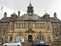 The frontage to Station Road is a symmetrical composition featuring the central Town Hall, with two wings – the library to the left and the King's Hall to the right. Everything is of two storeys and constructed of local ashlar stone with mullioned windows and steep, hipped slate roofs. The main entrance is recessed within Ionic columns and topped with a pediment.[1] The roof ridge contains a central clock turret, containing an illuminated hour-striking clock and bell installed in 1907 by Potts & Sons of Leeds.[3]