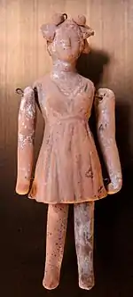The oldest exhibit is the 350 BCE articulated Etruscan ceramic doll.[13][17] There is a display of early English wooden dolls, including Miss Barwick,[18] dated c. 1750–1760. She was owned by the Barwick family of West Yeadon, and has a sedan chair with brocade furnishings embossed with a "B". Her face is sculpted with gesso on wood, her eyes are enamelled and her wig is made of real hair.[1] There is also the Lady Potter Palmer doll,[19] a Tudor stump baby.[20] and Tete Jumeau bisque dolls once owned by a Russian family.[21]