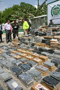Since the establishment of the War on Drugs, the United States and European countries have provided financial, logistical, tactical and military aid to the government of Colombia in order to implement plans to combat the illegal drug trade. The most notable of these programs has been the Plan Colombia which also intended to combat leftist organizations, such as the FARC guerrillas, who have controlled many coca-growing regions in Colombia over the past decades.[5] In 2010, cocaine production was 60% lower than at its peak in 2000. In that same year, Peru surpassed Colombia as the main producer of coca leaves in the world.[6] The level of drug-related violence was halved in the last 10 years and dropped below that of countries like Honduras, El Salvador, Venezuela, Guatemala and Trinidad and Tobago.[7][8][9]