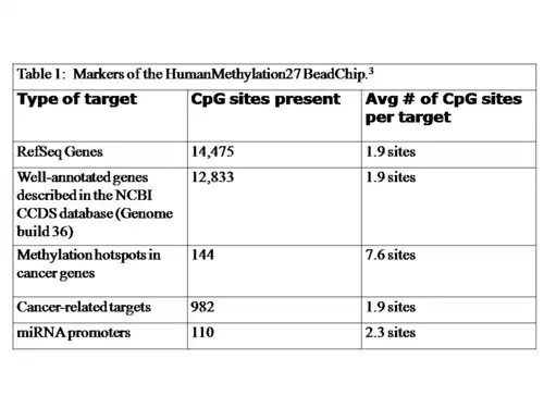 The Illumina 27k methylation chip contains 27,578 individual CpG sites, spread across 14,495 genes.[1] These genes include RefSeq genes from the NCBI CCDS Database, cancer genes that show differential methylation patterns during their course of progression and microRNA promoters.[5] The markers included in the chip are summarized in Table 1.[5]