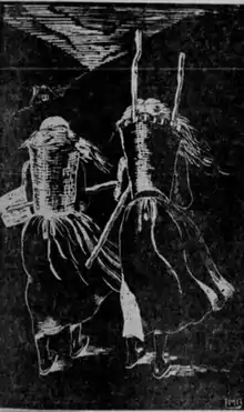 While studying in Munich, Bischoff had learned now to make woodblock prints and in 1927 won top prize in the first annual exhibition of American block prints held by the Philadelphia Print Club.[3] Her prize-winning print, "Homeward Bound", can be seen at left. Describing its subject as "two peasant women, bowed beneath the weight of heavily laden baskets on their backs, who are proceeding wearily along a road", a critic for The Philadelphia Inquirer praised its "fascinating conception".[8] A year later, Bischoff showed block prints and drawings with watercolor washes in a solo exhibition at the Ferargil Galleries in New York. She had made her first book illustrations the previous year and included some of the woodcuts from that work in the exhibition. A critic for The New York Times called the prints "effective" and the drawings "amusing".[9] In 1929, the Philadelphia Print Club gave her a solo exhibition that contained some of what a critic called her "celebrated block prints" displaying "modern in feeling and execution and in mood embody both sombreness and humor".[10] The following year, John Sloan selected a piece by Bischoff for the "Fifty Prints of the Year" touring exhibition sponsored by the American Institute of Graphic Arts.[11] Writing in Parnassus, Gertrude A. Rothschild said Bischoff's block print showed "fine restraint" in portraying "the sensation-hungry faces at a bullfight".[12] In that year she also showed at the Philadelphia Print Club's fourth annual Block Print Exhibition including pictures of Spanish subjects that a critic praised as especially brilliant.[13]