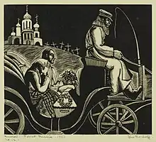 In 1930, Bischoff rented a spacious artist's studio and apartment in the Sherwood Studio Building on West 57th Street in Manhattan.[3][note 3] That year, she showed prints in the Philadelphia Print Club's second annual exhibition. Reviewing the show, C.H. Bonte said two of them, "At the Fair-Sevilla" and "Gypsy Dancers". were "Spanish transcriptions of effulgence, the disposition of the dancers being especially notable".[10] Throughout the 1930s, Bischoff continued to show in exhibitions of block prints assembled by the Philadelphia Print Club for the Brooklyn Museum. Reviewing the 1931 show, a critic said Bischoff's "Funeral in Soviet Russia 1930" from this show "might well be timeless in its representing of Slavic peasant grief".[15] This print is shown at right. During these years, she also participated in group shows at the Salons of America (1934), the National Academy (1945), the Pennsylvania Academy of Fine Arts (1937), and the Whitney Museum of American Art (1937).[16][17][18]