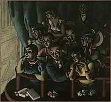 At the second annual Portrait of America exhibition in New York, held in 1945, Bischoff's painting, "Harlem Loge", won a $500 award [19] Made about 1934, the painting depicts African-American patrons in box seats at the Alhambra Theater in Harlem. It toured the country during the late 1930s in an exhibition of 32 paintings assembled by the Pennsylvania Academy of Fine Arts and sponsored by the American Federation of Arts.[3][19] This painting is shown at left. Although the figures it shows seem to be caricatures, it received positive critical attention as well as the prize. Critics saw it as humorous, dramatic, or powerful.[20][21][22] Calling it one of the most striking works in the show, a critic said it was "subtle and rich" and praised the composition as "exceptionally well handled".[23] Bischoff retained the painting and, in 1948, gave it to the gallery of Dartmouth College, located a few miles from her summer home in Hartland.[24] Dartmouth exhibited her works from 1947 until the end of her career, including 1947 (solo), 1949 (solo), 1954 (group of three), 1955 (solo), 1961 (group), 1966 (retrospective), and 1986 (solo).[16][25][26][27][28]