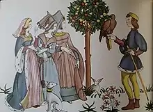 Books containing Bischoff's illustrations in the immediate postwar years include Super-market secret by Emilie Vinall (New York, T. Y. Crowell Co., 1945) and Reuben and His Red Wheelbarrow by Alice Dalgliesh (New York, Grosset & Dunlap, 1946). A newspaper reproduced one of her illustrations in its review of the 1949 edition of a fourteen-volume encyclopedia, Childcraft (Chicago, Field Enterprises) saying, "The spirit of heraldry and chivalry characteristic of the Middle Ages is vividly expressed in this drawing by Ilse Bischoff".[37] This illustration is shown at right.