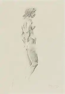 Throughout most of her career, Bischoff chose mainly human figures as subjects. Her 1950 drawing of a standing female nude is shown at right. She had high regard for great portraitists like Albrecht Dürer and John Singer Sargent as guides but did not place great value on her skill at capturing a human likeness.[3] As she began to spend more time working at her summer place in Vermont, she turned more to still lifes, there not being human models available to her there. Committed to her own version of realism from an early date, she did not become aware of pure abstraction until well into her career and once she had encountered it, she rejected it as a style. She said she "liked the little niche" she had created for herself and "went right on working in it".[3]