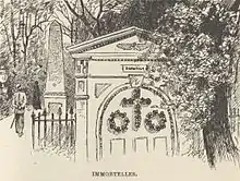 In Life on the Mississippi, Mark Twain comments on burial practices in New Orleans: "They bury their dead in vaults, above the ground. ... Fresh flowers, in vases of water, are to be seen at the portals of many of the vaults: placed there by the pious hands of bereaved parents and children, husbands and wives, and renewed daily. A milder form of sorrow finds its inexpensive and lasting remembrancer in the coarse and ugly but indestructible 'immortelle'—which is a wreath or cross or some such emblem, made of rosettes of black linen, with sometimes a yellow rosette at the conjunction of the cross's bars—kind of sorrowful breast-pin, so to say. The immortelle requires no attention: you just hang it up, and there you are; just leave it alone, it will take care of your grief for you, and keep it in mind better than you can; stands weather first-rate, and lasts like boiler-iron."[1]