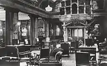 Round about 1910 an extension to the hotel took place and construction was completed in 1913.[5] As part of the extension, Turkish baths were constructed.[6] The hotel had about 640 bedrooms.[7] The building was equally colossal as its neighbour the Kimpton Fitzroy London Hotel and the architectural style was a mixture of Art Nouveau Tudor and Art Nouveau Gothic, combining terra-cotta ornaments in which the corbels, gargoyles and statues were modelled with red brick. Towers rose above a high mansard roof of green copper. A Winter Garden occupied the ground floor between the two bedroom wings. Both Winter garden and Turkish Baths were decorated in glazed Doulton ware.[8]