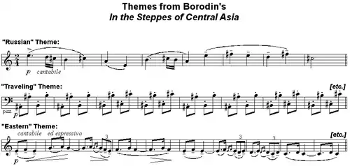 The work depicts an interaction between Russians and Asians in the steppe lands of Central Asia. A caravan of Central Asians is crossing the desert under the protection of Russian troops. The opening theme, representing the Russians, is heard first; after it, the strains of an ornamented eastern melody on English horn, representing the Asians. The melodies eventually combine contrapuntally. Amid these two ethnic melodies Borodin inserts a "traveling" theme in pizzicato that represents the plodding hoofs of the horses and camels. At the end, only the Russian theme is heard.