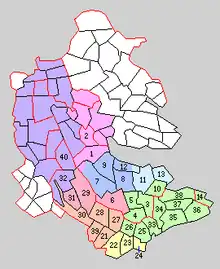 Towns and villages with number of the Shida (1-14) and Kōchi (21-40) districts in 1889. Currently in      Peach: Tsuchiura City,      Orange: Ryugasaki City,      Red: Ushiku City,      Purple: Tsukuba City,      Yellow: Kawachi Town,      Green: Inashiki City,      Blue: Ami Town,      Light Blue: Miho Village.