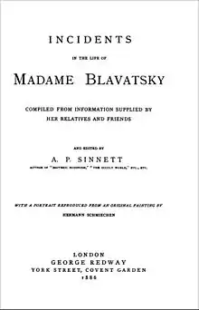 Incidents in the Life of Madame Blavatsky: compiled from information supplied by her relatives and friends is a book originally published in 1886 in London;[1][2] it was compiled by a member of the Theosophical Society, A. P. Sinnett, who was the first biographer of H. P. Blavatsky (née Hahn).[3] Sinnett describes the many unusual incidents in Blavatsky's life beginning from her childhood in Russia, and asserts that Blavatsky had "an early connection with the supernatural world;" Sinnett also writes about Blavatksy's short, unlucky marriage and "decade of extensive global travels," about her period of learning in Tibet, and the "criticism she received about some of her 'phenomena' and practices."[4][note 1]