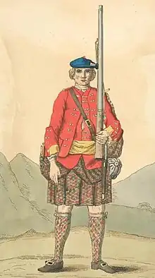 In September 1745, Duncan Forbes, Lord Culloden, a staunch "whig", was given a commission to raise twenty new Independent Highland Companies to oppose the Jacobite rising of 1745. He succeeded in raising a total of eighteen Independent Highland Companies.[33] The men were drawn from the respective clans of their commanders. Many clansmen although not related to their chief adopted the chief’s surname as their own.[34] For example, 59 out of 93 men listed by David Dobson in George Munro of Culcairn’s company in 1745, had the surname Munro.[35] The commanders of each of the 18 Independent Highland Companies are given in the table below in order of the company’s completion.[36] In some of the companies not all of the officers are of the clan name of their company.[37] This table does not include regular regiments of the line who were also drawn from the Highlands at this time such as Loudon's Highlanders and the Earl of Crawford's Highland Regiment. The semi-professional independent companies are also often confused with the non-professional local militia companies who also supported the Government but who were less cohesively organized.[38][39]