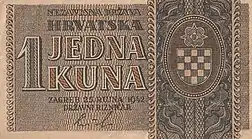 The kuna was the currency of the Independent State of Croatia in the period between 1941 and 1945 during World War II. The word kuna means "marten" in Croatian and the same name is used for the modern Croatian kuna currency, which was later replaced with the euro. This kuna was subdivided into 100 banica. It was preceded and replaced by the Yugoslav dinar.