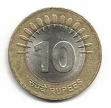 The second design featured two horizontal lines. The coin featured the lettering "भारत" and "INDIA" on the top, with Lion Capital in the middle and year of printing at bottom on the obverse. The reverse of the coin featured 15 notches and numeral 10 in the middle and at below line the word Rupees in English and रुपये in Hindi was written.[3][4]