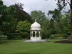 Wajid Ali Shah (1832-1887), the last Nawab of Awadh, built the Qaisar Bagh palace complex in his capital city, Lucknow, between 1847 and 1856.[1] It comprised a series of courts, with pools and gardens, surrounding the central palace. The complex was designed in the Mughal style and the gardens were decorated with “many small marble pavilions and kiosks”.[lower-alpha 1][3] Ali Shah was deposed by the British in 1856, and the state of Awadh annexed by the British East India Company. This action caused enormous resentment and the population of Lucknow was enthusiastic in support of the Indian Rebellion which broke out the following year.[4] The siege of the Lucknow Residency lasted almost six months, and the subsequent retaking of the city in March 1858 saw the looting and destruction of the Qaisar Bagh.[lower-alpha 2][6] Charles Canning selected the kiosk as a tribute to Queen Victoria and had it shipped to England in 1858.[7]