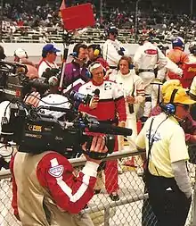 When Paul Page entered the booth in 1977, he swiftly changed the face of the network, and in his own words, "brought the broadcast into the present tense."[4][36] He turned the coverage into a true live, play-by-play, sporting event broadcast, similar to what had been used by Motor Racing Network, which had covered some NASCAR, USAC, and Formula One races on the radio at the time.[21] He "locked the doors" of the broadcast booth,[37] effectively eliminating the mundane celebrity interviews, and gave the turn reporters a higher level of play-by-play responsibility. With the help of technicians, Page invented a custom switchboard to facilitate the turn and pit reporters. Page himself donned a headset that had instant communication between himself and the turn reporters,[4][38][24] and without hesitation, would throw the call to the turn reporters as he saw appropriate. By the mid-1980s, the radio booth was equipped with a television monitor which could pick up the ABC-TV raw satellite feed, which gave the announcers access to replays for the first time. The new improved style of broadcasting was well-received, and earned critical praise for the seamless around-the-track call of the 1982 finish.[4][6][21]