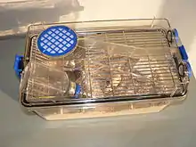 The cages are constructed and designed in a specific way to ensure an absolute microparticle free inner environment. This generally includes a cage bottom, a cage top (with a food hopper and water bottle holder incorporated) and a filter lid. It is also designed to allow maximum comfort of the animal and to provide a secure, chew proof environment. An external ventilation unit supplies the cages with fresh HEPA-filtered air which passes through the filter lids. The ventilation-system mostly consists of two tubes for ingoing and outgoing air.