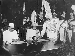 ![]() Prime Minister of Nepal, Mohan Shamsher Jang Bahadur Rana and Indian Ambassador to Nepal, Chandeshwar Prasad Narayan Singh signing the treaty, 31 July 1950 | |
