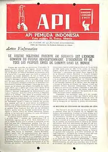 Indonesian Tribune and Api Pemuda Indonesia were the two main organs of the pro-Chinese wing of PKI.[6][9] These publications were illegal inside Indonesia, and one could be arrested for possessing a copy.[9][10] They were distributed by mail to Indonesia, posted from non-communist states (in particular via the Netherlands).[10][11] By the late 1970s, circulation of these organs had dropped significantly. In the midst of the Sino-Albanian split some Indonesian communists left Albania. As a result, the publishing activity of the Indonesian group in Tirana decreased.[9] The International Institute of Social History holds a number of issues of Api Pemuda Indonesia, spanning from 1968 to 1978.[12] It also holds a smaller number of copies of Indonesian Tribune, issued between 1966 and 1975.[13]