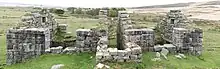 The extensive quarries at Foggintor provided granite for the construction of London's Nelson's Column in the early 1840s, and New Scotland Yard was faced with granite from the quarry at Merrivale.[2] Merrivale Quarry continued excavating and working its own granite until the 1970s, producing gravestones and agricultural rollers. Work at Merrivale continued until the 1990s, for the last 20 years imported stone such as gabbro from Norway and Italian marble was dressed and polished.[3] The unusual pink granite at Great Trowlesworthy Tor was also quarried, and there were many other small granite quarries dotted around the moor. Various metamorphic rocks were also quarried in the metamorphic aureole around the edge of the moor, most notably at Meldon.[4]