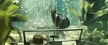 Spielberg stated before production began that very few CGI effects would be used to maintain consistency with the other films. During filming significantly more CGI work was done than initially anticipated as in many cases it proved to be more practical. There ended up being a total of about 450 CGI shots in the film, with an estimated 30% of the film's shots containing CG matte paintings.[60] Spielberg initially wanted brushstrokes to be visible on the paintings for added consistency with the previous films, but decided against it.[17] The script also required a non-deforested jungle for a chase scene, but this would have been unsafe and much CGI work was done to create the jungle action sequence. Visual effects supervisor Pablo Helman, who worked on Lucas' Star Wars: Episode I – The Phantom Menace (1999) and Star Wars: Episode II – Attack of the Clones (2002) as well as Spielberg's War of the Worlds and Munich, traveled to Brazil and Argentina to photograph elements that were composited into the final images. Industrial Light and Magic then effectively created a virtual jungle with a geography like the real Amazon.[67]