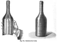 The original "any drink" methods using bottles were similar to Hocus Pocus, simply on a smaller scale. Most variations used what appeared to be a bottle but was actually a tin container japanned (lacquered) green to appear like glass.[9] The internal area is divided into sections and each one empties into a tube that ends just short of the neck.[10] Very small holes drilled into the bottle allow them to be selected in the same fashion as Hocus Pocus, with the magician's hand holding the bottle so their fingers cover the holes; lifting one starts the pour.[9][10] The tea kettle varieties simply moved the holes to the handle. A slight variation on the theme is the Magic Funnel, which uses a two-walled funnel holding liquid between the walls. The magician pours a small amount of liquid through the funnel as normal, but it continues to pour when they lift their finger from a hole on the handle.[11]