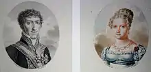 King Ferdinand VII remained childless during the 1820s. His third wife, Maria Josepha Amalia of Saxony was barren. It was expected that his second brother, Infante Carlos, would succeed him. Religious and conservative, Don Carlos was married to the Portuguese Infanta Maria Francisca of Braganza. The couple had three sons. Infante Francisco de Paula supported his brothers's absolutist political views even if his own were more moderate liberal, but his energetic wife constantly dragged him into endless political struggles. Luisa Carlotta, although constantly pregnant, was meddlesome with a keen interest in government affairs.[30] As she had a grudge against Maria Francisca and Maria Francisca's sister, Maria Teresa, Princess of Beira (widow of Francisco de Paula's cousin, Infante Pedro Carlos), Luisa Carlotta was determined to avoid Don Carlos becoming King after Ferdinand VII's death.[31] The opportunity came with the death of Queen Maria Josepha in May 1829.[32] On good terms with her brother in law Ferdinand VII, Luisa Carlotta convinced the king to marry her sister Maria Christina of the Two Sicilies. Their wedding took place in December that same year. The eldest of Ferdinand VII and Maria Christina's two daughters, Isabella, became heir to the crown thanks in great part to Luisa Carlotta's intervention. Don Carlos and his family opposed the change of the succession and they had to leave the country.[32] Ferdinand VII died shortly after, on 29 September 1833.[32]