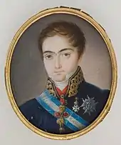 Born on 10 March 1794 at the Royal Palace of Aranjuez, Infante Francisco de Paula was the fourteenth child of King Carlos IV of Spain (1748–1819) and his wife Maria Luisa of Parma (1751–1819), a granddaughter of King Louis XV of France.[1] He received the names Francisco de Paula Antonio Maria.[1] His parents had married twenty-nine years earlier and Francisco de Paula was the couple's last child. As the youngest in a large family, he was his mother's favorite.[2] His father, King Carlos IV, had a passion for hunting and collecting clocks, but little interest in political affairs.[3] He took a passive role in the direction of his own kingdom, leaving the government to his wife and to his prime minister, Manuel Godoy. Queen Maria Luisa thoroughly dominated the king. Lacking the political acumen necessary to hold power on her own, Maria Luisa deposited her trust and the rule of government on Godoy, whom she raised to prominence.[3] Court rumors attributed the paternity of Francisco de Paula and his sister Maria Isabel, not to the king, but to Godoy.[1] However, recent biographers and historians have found these claims to be both unproven and unlikely.[2][4]