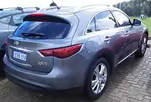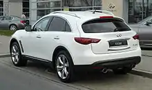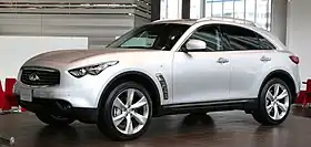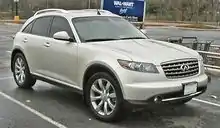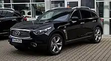 The Infiniti QX70, formerly called the Infiniti FX until 2013, is a compact luxury[2] crossover SUV produced by the Nissan-owned Infiniti luxury vehicle brand between 2002 and 2017. The FX replaced the QX4 as Infiniti's mid-size SUV. It shares the same FM platform as the rear-wheel drive Nissan 370Z, and it "made no claims of climbing mountains." Rather, its aggressive shape promised style and quick handling.[3] The similarly sized Nissan Murano is based on the same D platform as the front-wheel drive Nissan Altima. The FX does not have a Nissan-branded equivalent and is not sold in Japan.