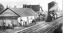 The town's name comes from an Irish-language epithet for Ireland, Inis Fáil, "Isle of Destiny".[6] Before this name was adopted, the town was often referred to as "Poplar Grove".[7] Sandy Fraser, Napoleon Remillard, Arthur Content and Bill Kemp settled in the area from 1884 to 1887. These were Innisfail's first settlers. Dr. Henry George was an important physician and coroner for Calgary and Central Alberta. He settled in Innisfail and built a house he called "Lindum Lodge" (this is where the Dr. George/Kemp house is today). Later the house was occupied by Bill Kemp and Kate Jane Kemp, who ran it as a boarding house until the 1960s.[8] More people continued to move to the Innisfail area. The construction of the railroad attracted more settlers and business. One of the first businessmen in the area was G. W. West. He is very important to Innisfail's past as he ran a general store, meat market, and grocery store. He was Innisfail's first proprietor when he moved here in 1891. By the 1900s, Innisfail was a village. Some of the early businesses included the Union Bank, the Murray Hotel, Hotel Alberta, the New York Café, the Modern Café, the Paris Café, the Opera House and the West Store.[9]