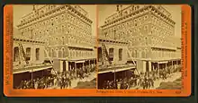 Construction of a new International Hotel began in May 1876, on the same site as the original buildings.[2] The hotel project, modeled after the Palace Hotel in San Francisco, was financed by owners Albert Hanak and Ike Bateman.[4] The six-story hotel stood 109 feet (33 m) high,[1] and was built at a cost of $600,000.[5] It opened as the tallest building in the state[6] on the night of March 31, 1877.[2][5] Attendees at the grand opening included businessmen James Graham Fair and John William Mackay, as well as U.S. Senator William Sharon and politician John Henry Kinkead.[5]